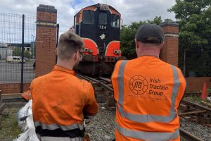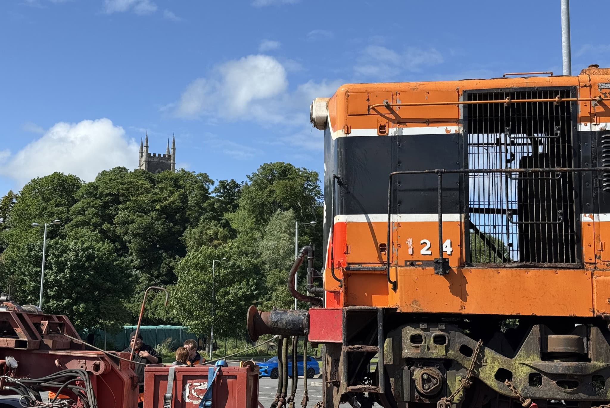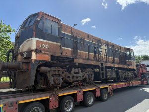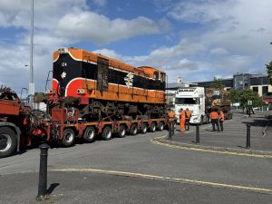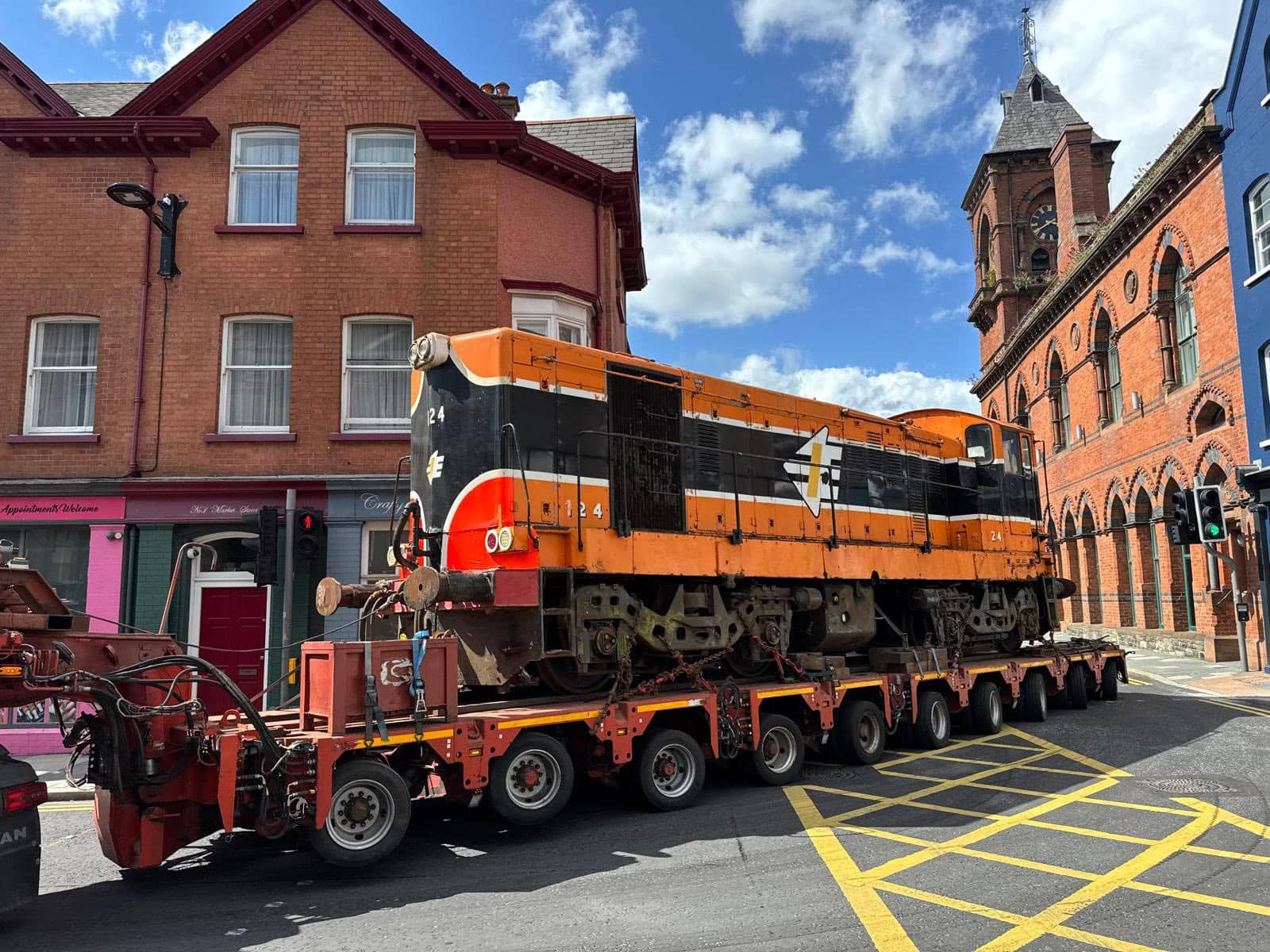 After nearly 12 months in the planning and execution, four ITG locomotives stored at the West Clare Railway at Moyasta are moving to start a new life at the Downpatrick & County Down Railway. Railway Support Services Ltd carried out the long, slow and tricky transfers of the first two locos, 121 class loco 124 and 181 class loco 190, over the course of Saturday 31st May to Sunday 1st June. This was a truly mammoth effort from our volunteers and our friends at DCDR.